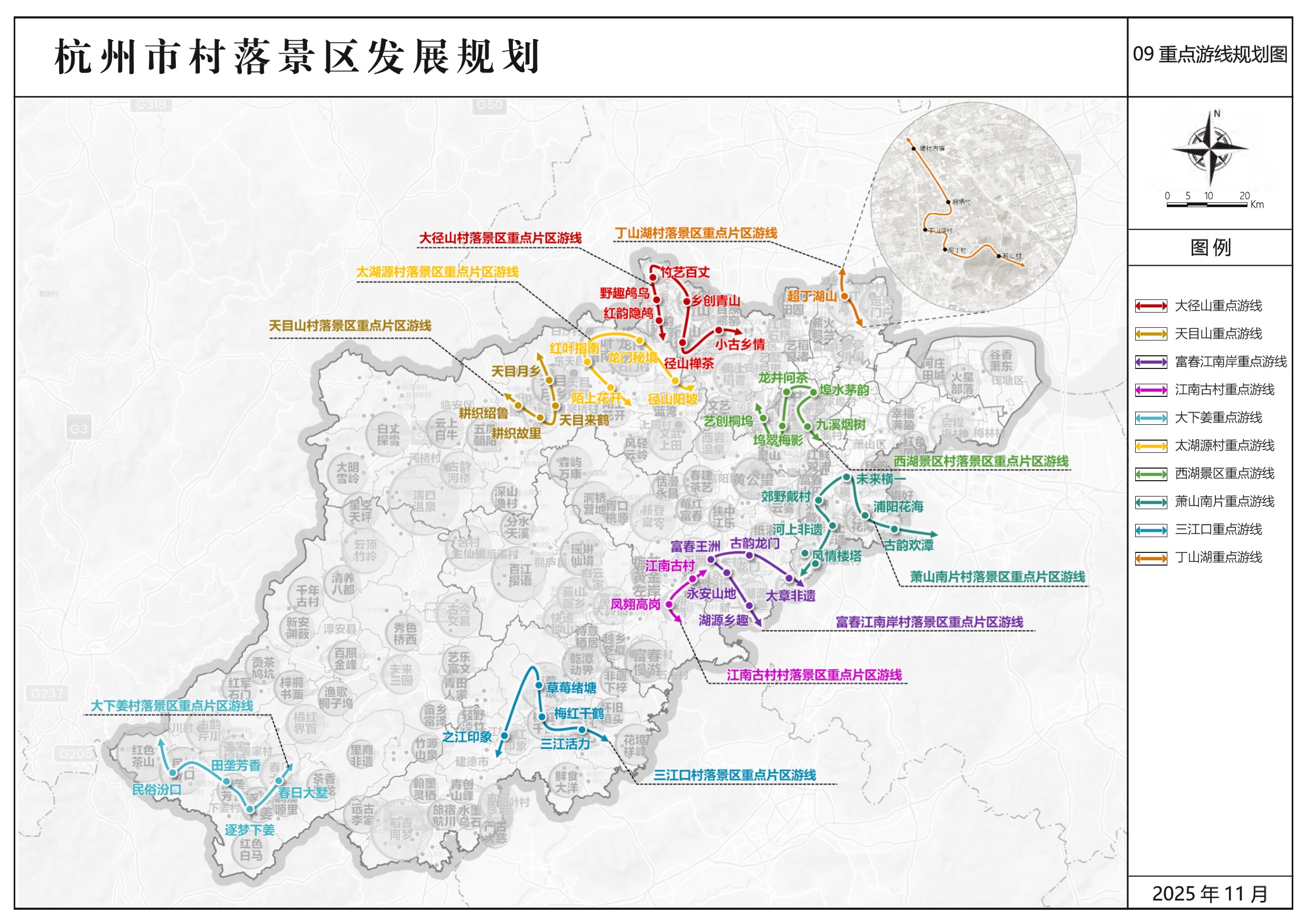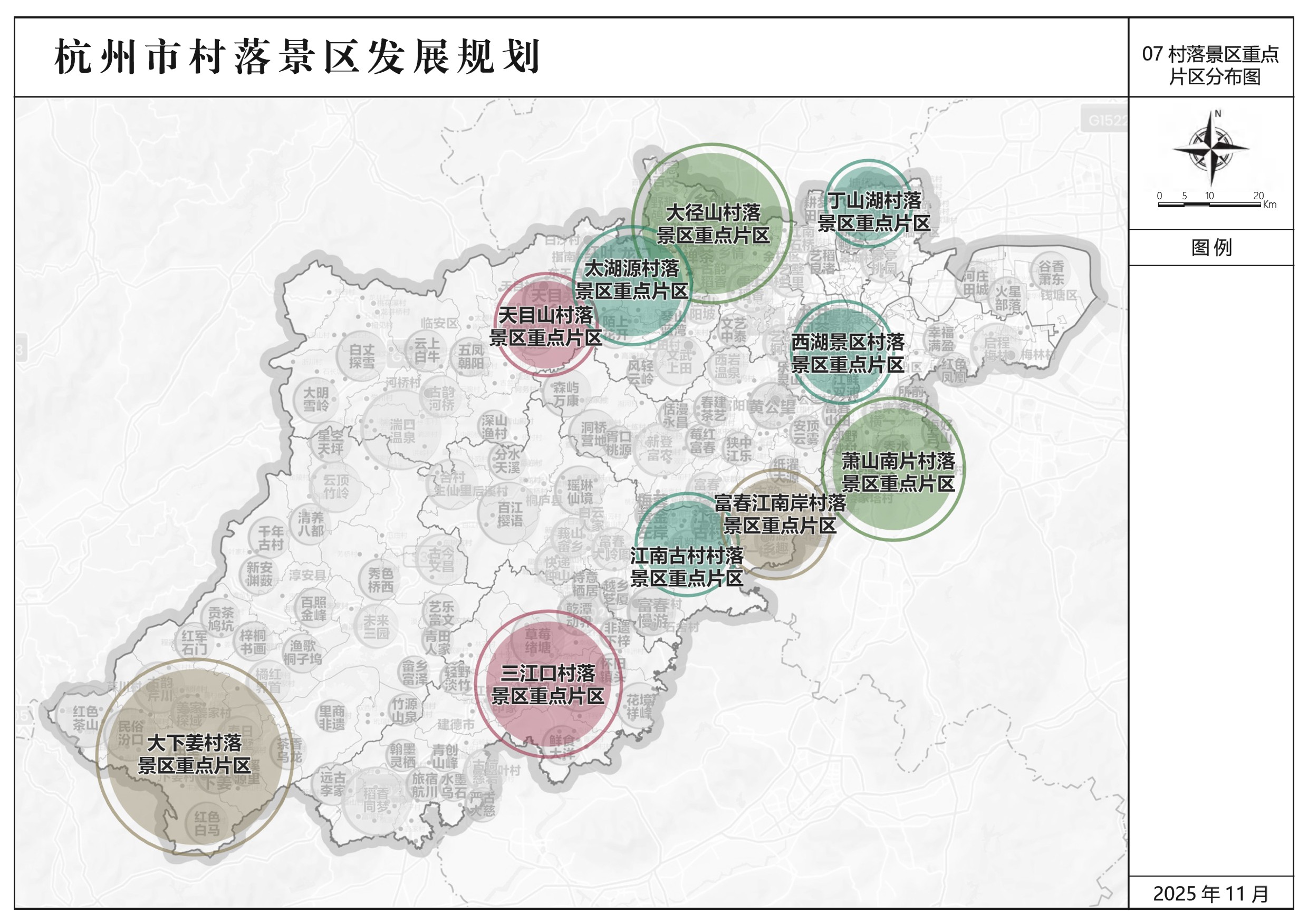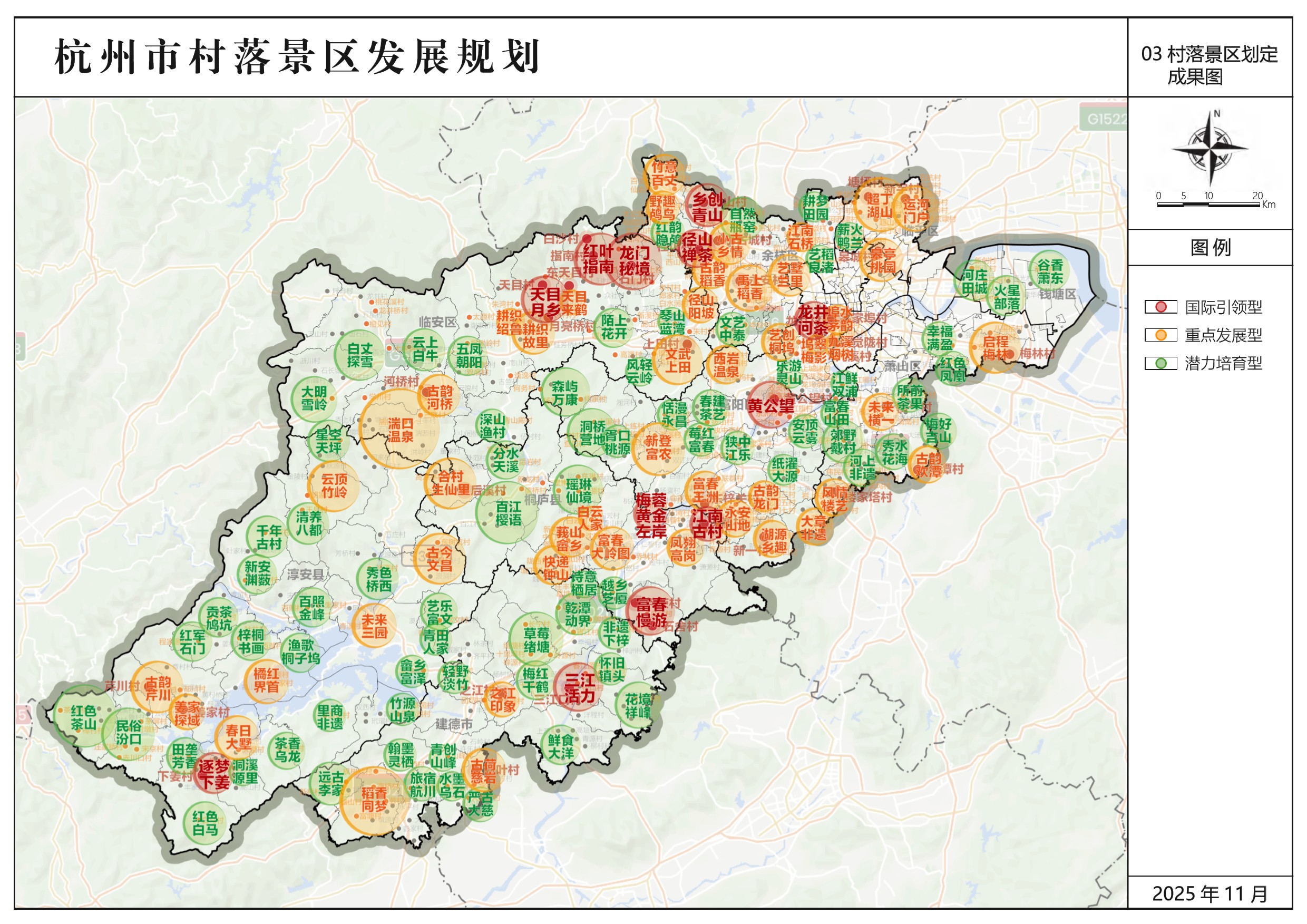 杭州乡村旅游经过三十年的发展,历经从农家乐初步探索,到规范化、标准化建设再到市场化、品牌化运营的跨越式演进,已奠定了坚实基础。在此背景下,《杭州市村落景区发展规划》应运而生,作为杭州市响应乡村振兴与共同富裕国家战略、打造“江南味”乡村旅游品牌的专项规划,旨在推动杭州乡村旅游从“美丽乡村”向“共富景区”的全面升级。规划通过对全市1905个行政村系统摸排, 创新提出“国际引领型、 重点发展型、 潜力培育型”三级村落景区发展体系,共划定136个村落景区和10大重点联动片区,并以“资源活化、运营赋能、品牌共建”为核心路径,助力杭州建设国际化旅游目的地,打造长三角乡村旅游度假首选地。
