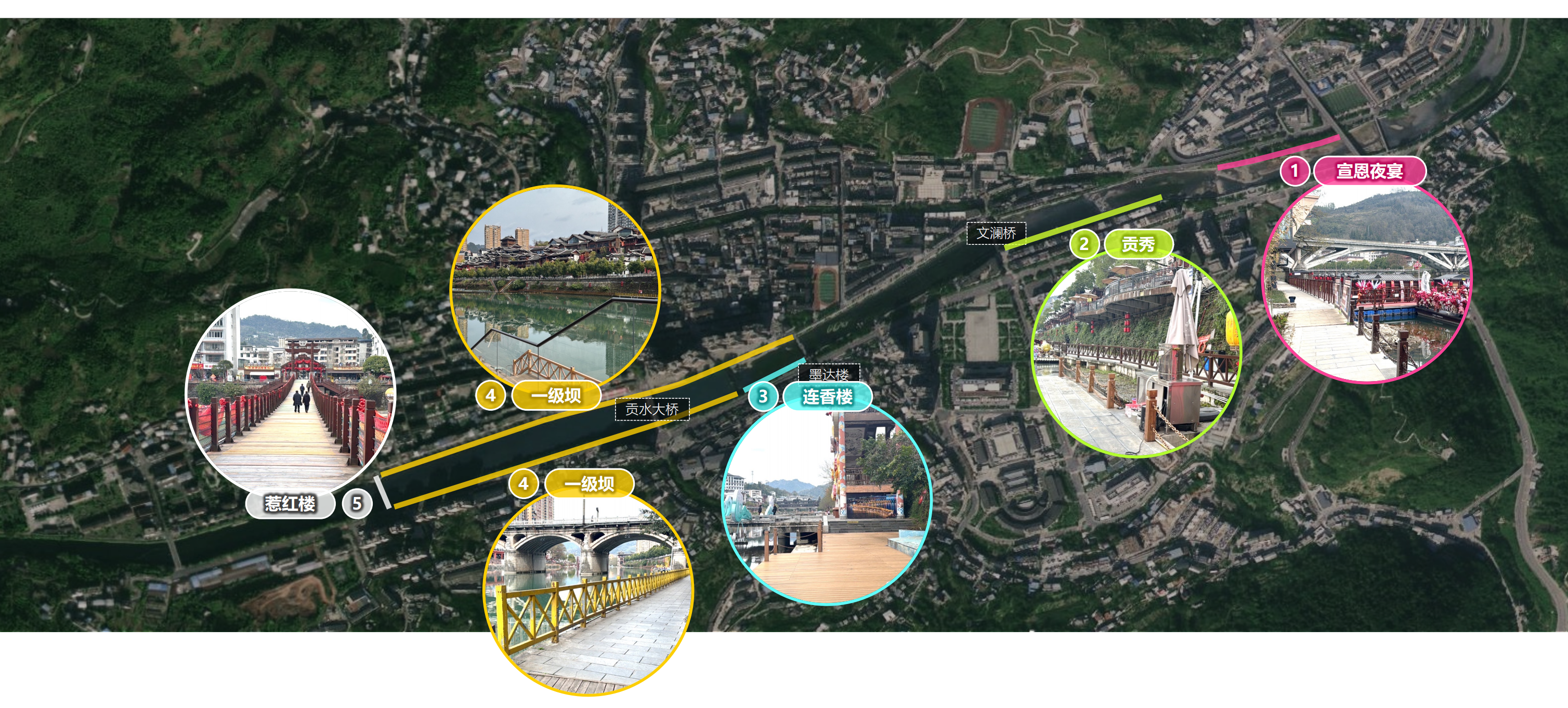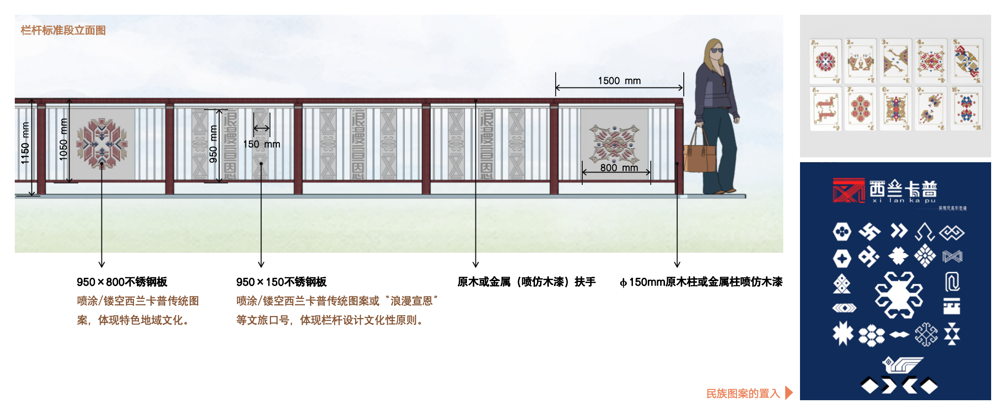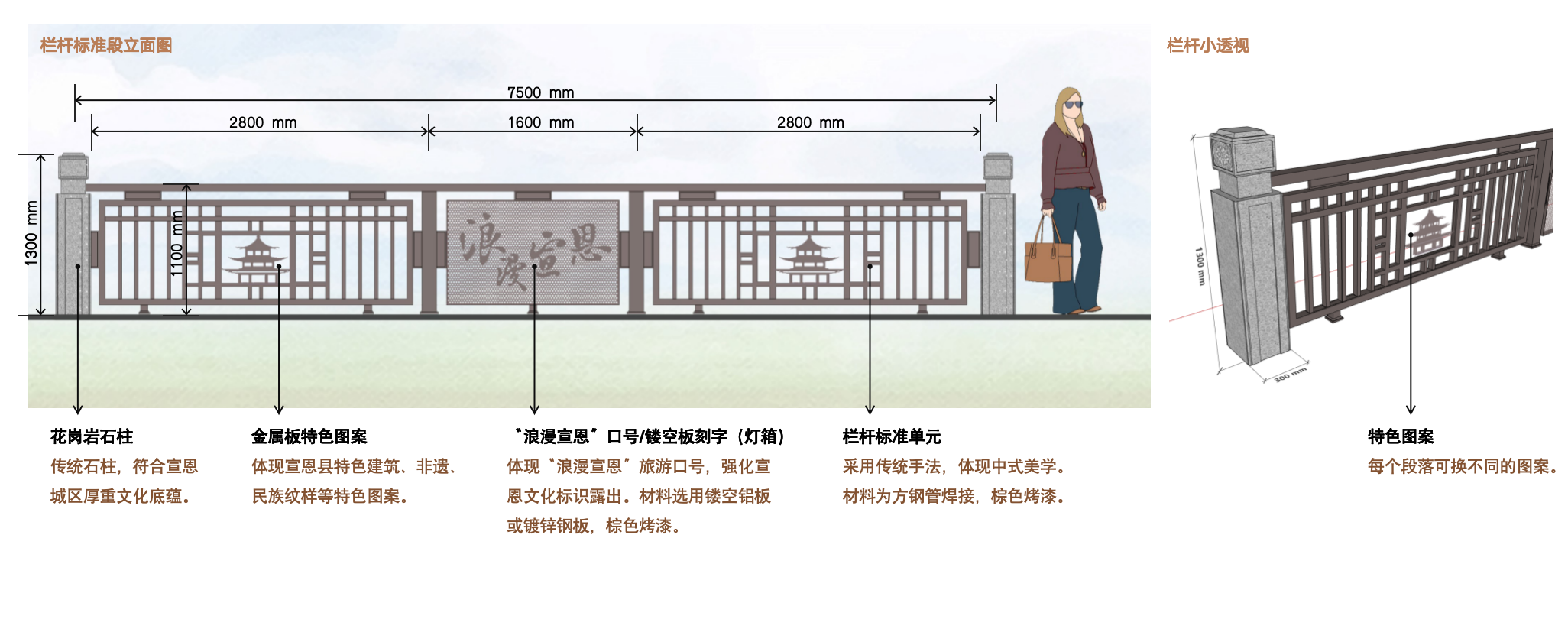 文化融合,主题鲜明。贡水河栏杆设计深度融合了宣恩民族文化内涵和浪漫城市气质,并在栏杆造型与装饰细节上融入特色文化图案、文旅宣传口号、非遗传统纹样等元素,有效强化“浪漫宣恩”的文旅品牌形象。