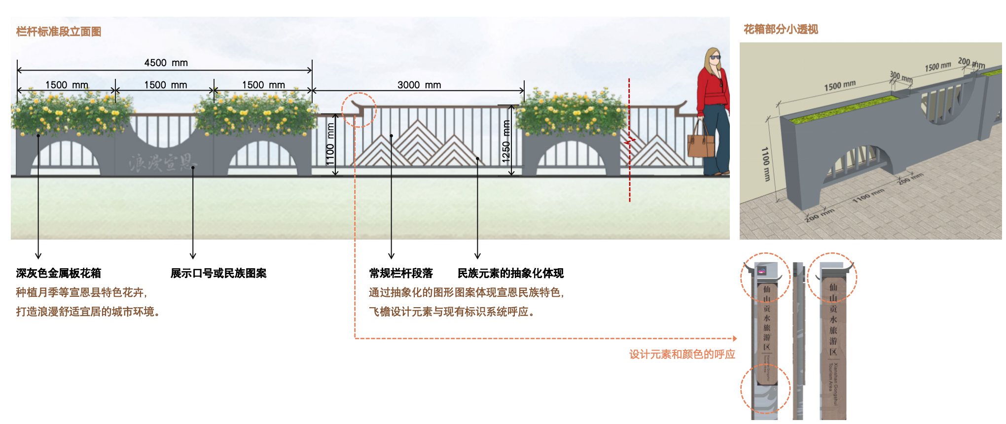 生态友好,人文关怀。在花箱栏杆段植入宣恩特色花卉品种,营造出浪漫宜居的滨河休闲环境,充分体现生态与人文共融的设计理念。