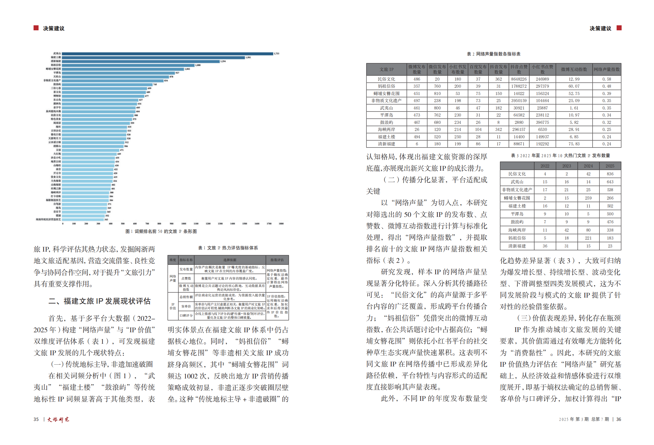 文章基于对福建文旅IP发展现状的系统评估,构建了“网络声量”与“IP价值”双维热力模型,精准识别出“传统地标主导+非遗加速破圈”的结构特征,并指出在传播路径、价值转化等方面存在的瓶颈。