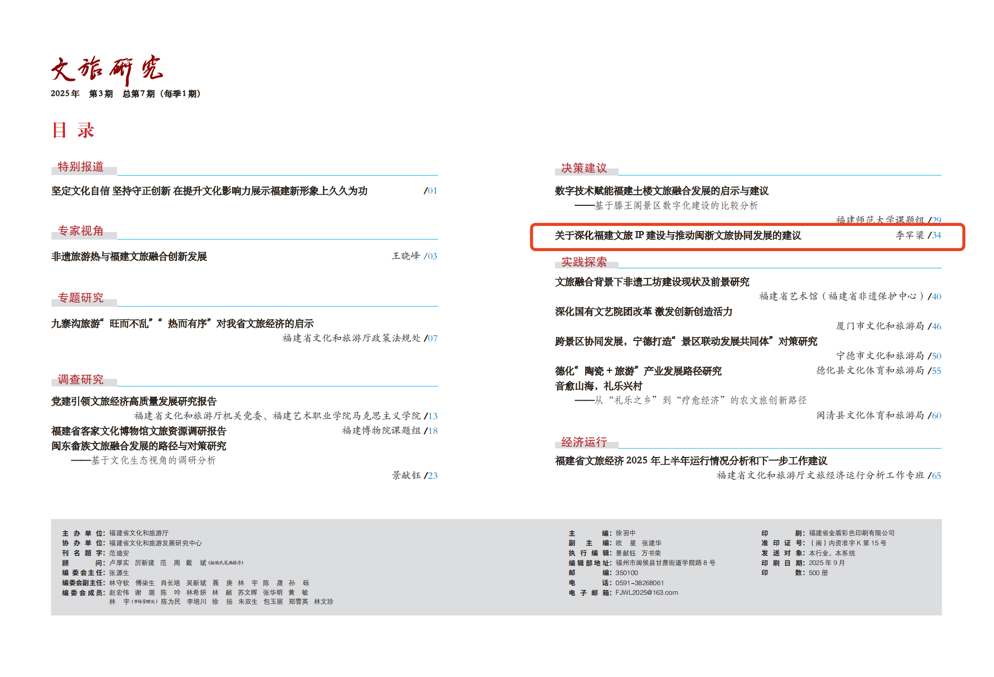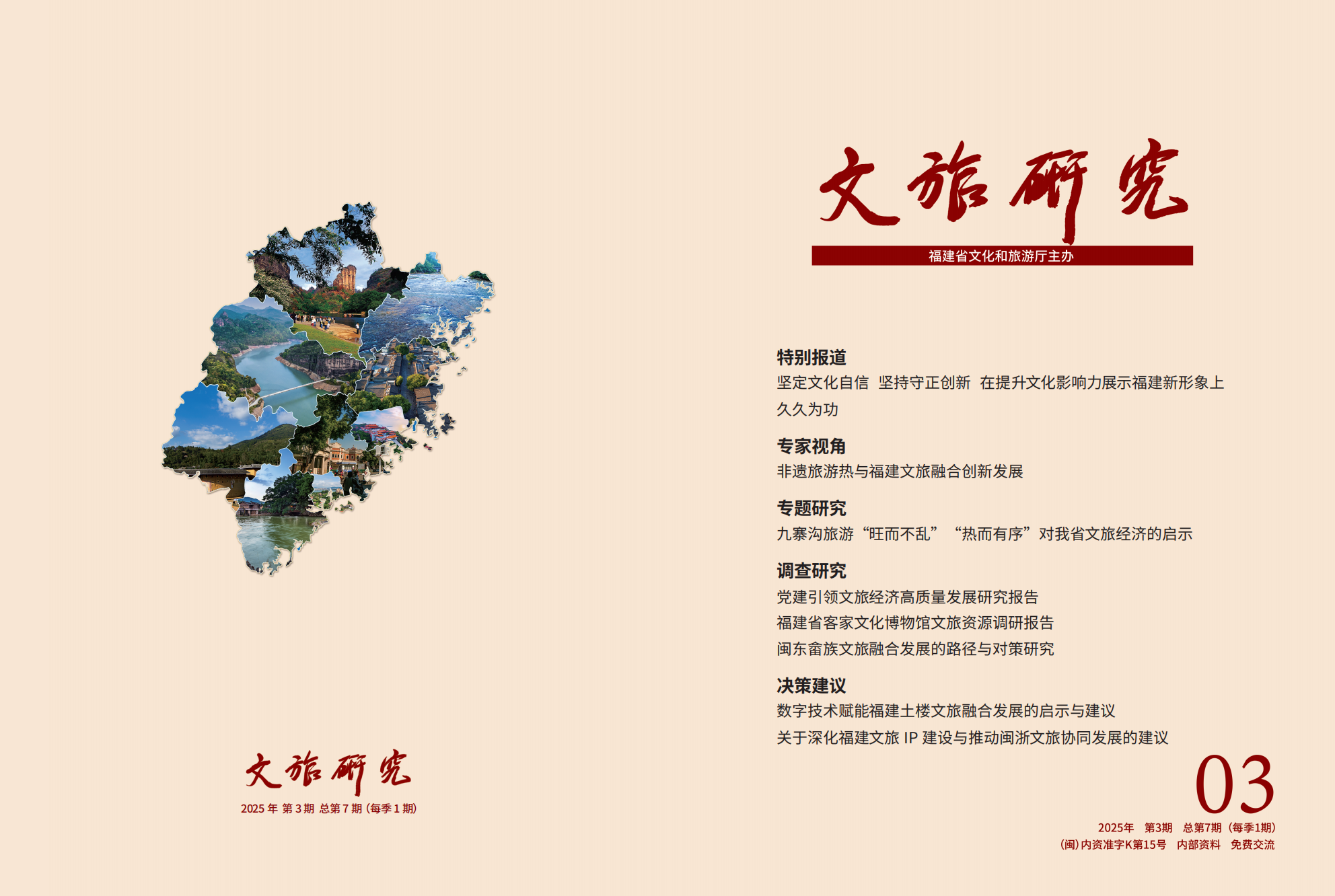 ▲《文旅研究》2025年第3期版面(节选)《文旅研究》是由福建省文化和旅游厅主办的权威内部刊物。该刊物内容兼具政策高度、学术深度与实践价值,是洞察福建文旅发展政策导向与实践动态的重要窗口。其主要栏目包括特别报道、专家视角、专题研究、调查研究、决策建议、实践探索以及经济运行分析。