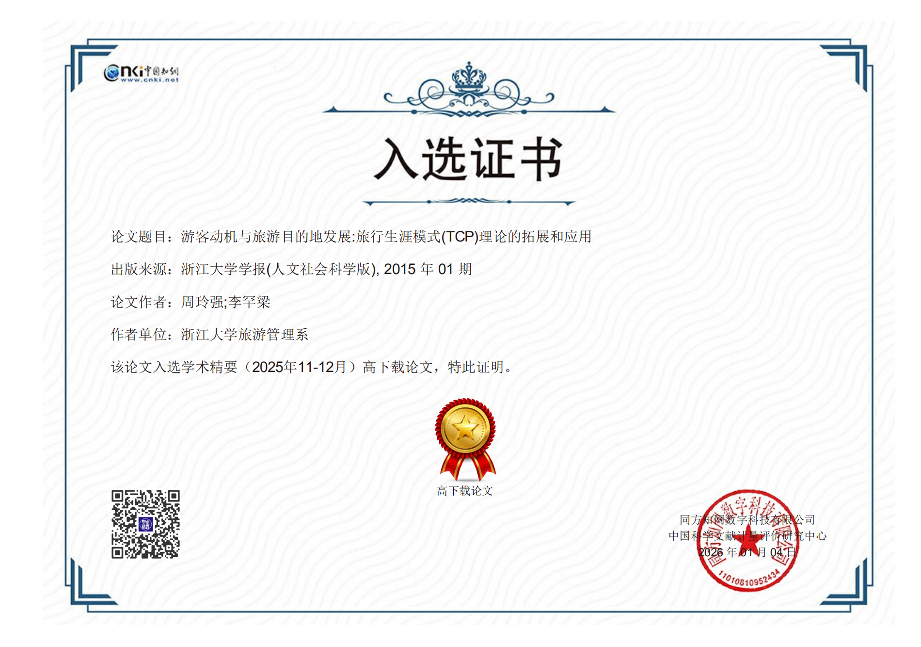 近期,中国知网《学术精要数据库》(https://xsjy.cnki.net/)发布了2015—2025年高影响力论文。由李罕梁博士作为第一作者发表的《“洋家乐”游客的动机、感知价值对其满意度和行为意愿的影响》与《游客动机与旅游目的地发展:旅行生涯模式(TCP)理论的拓展和应用》两篇论文成功入选。早在2023年,《“洋家乐”游客的动机、感知价值对其满意度和行为意愿的影响》就已入选中国知网《学术精要数据库》(2013-2023年)高影响力论文。此次李罕梁博士论文的持续入选,印证了经典研究的持久生命力。