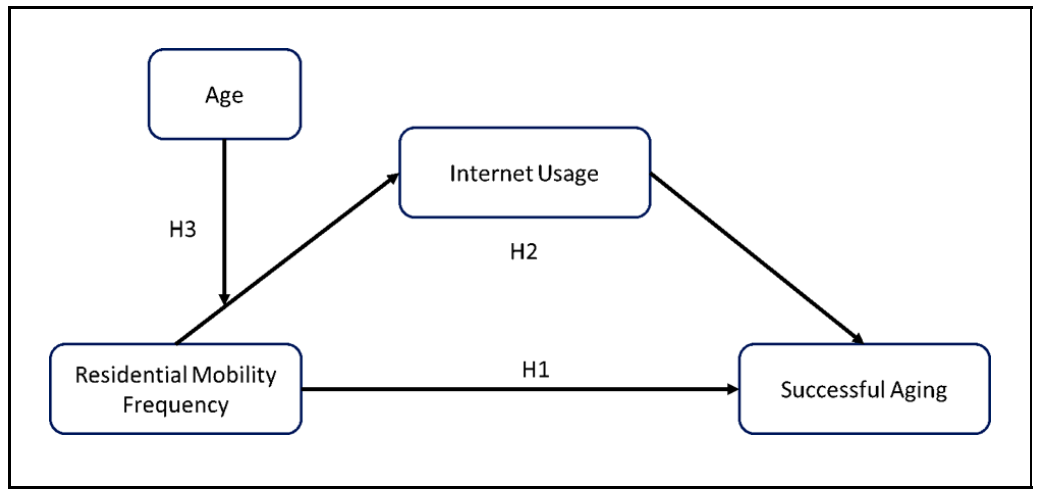 居住流动可能破坏老年人基于地域的社会联结与社区融入,而数字参与则能成为重要的补偿机制,缓解居住流动带来的负面影响。从生命历程理论视角来看,互联网使用可以通过推动老年人的适应性行为、减少信息不对称、增强决策自主性等路径,缓冲其在生命历程中积累的不利因素(Hutchison &Levesque,2017;Settersten,2018)。研究提出假设:互联网使用在居住流动性与安享晚年之间发挥中介作用,积极参与数字活动、具备一定数字应用能力的的老年人,能有效减少居住搬迁带来的不利影响。