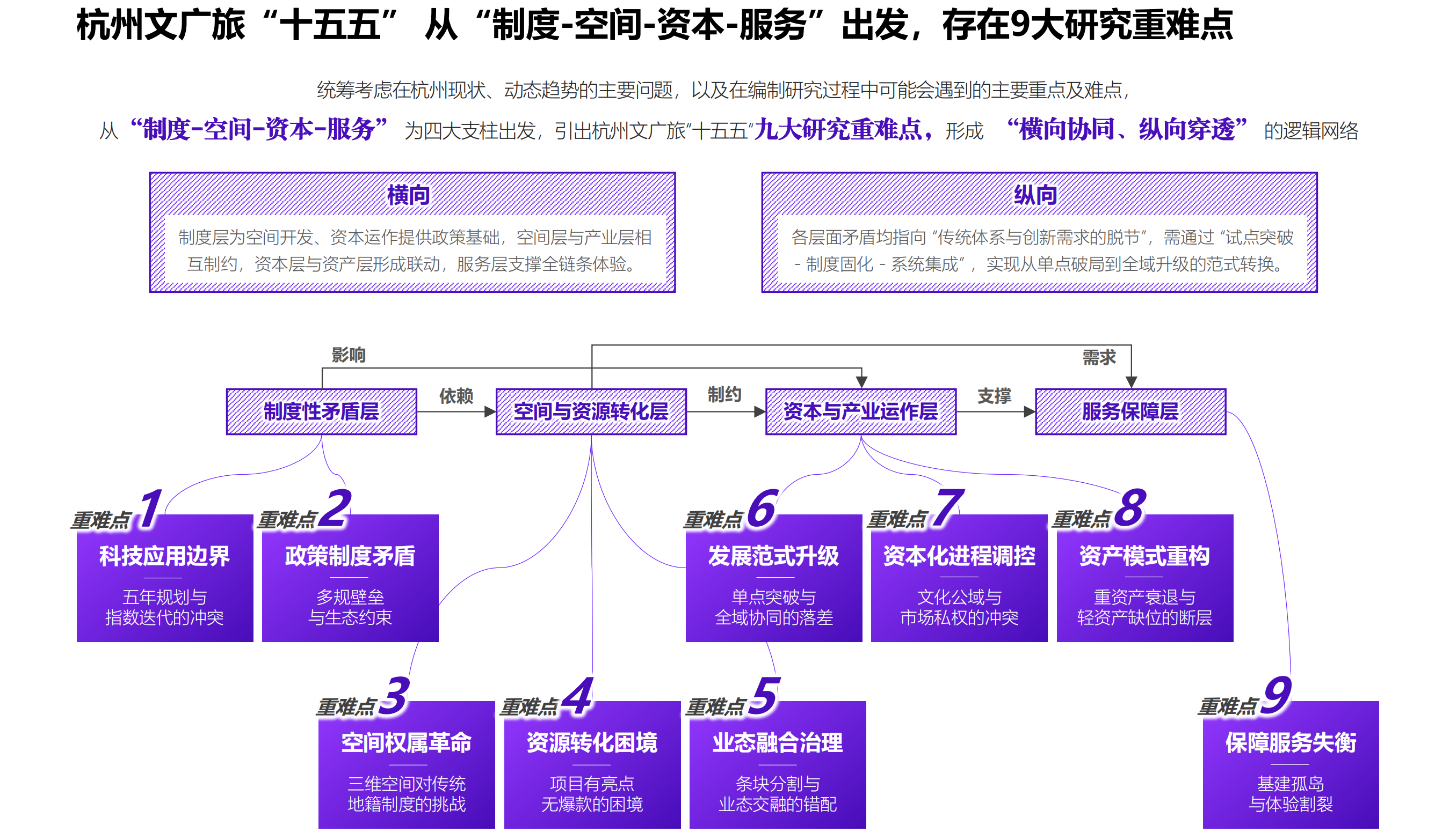 本项目立足杭州“数字经济第一城”与“三大世界遗产”的双重优势,系统勾勒出文旅融合的未来发展路径,旨在推动文化基因与现代科技、旅游体验的深度融合。项目从文化本源解码、发展动能重构、三维融合创新、六大实施路径等多个维度展开,聚焦低空经济、数字孪生、人工智能等前沿领域,培育Z世代消费新经济、国际文旅贸易港等新动能,打造世界遗产活化、数字文娱矩阵、国际演艺枢纽等核心载体,最终助力杭州建成具有国际影响力的历史文化名城和世界一流旅游目的地,为全国文旅深度融合提供“杭州范式”。