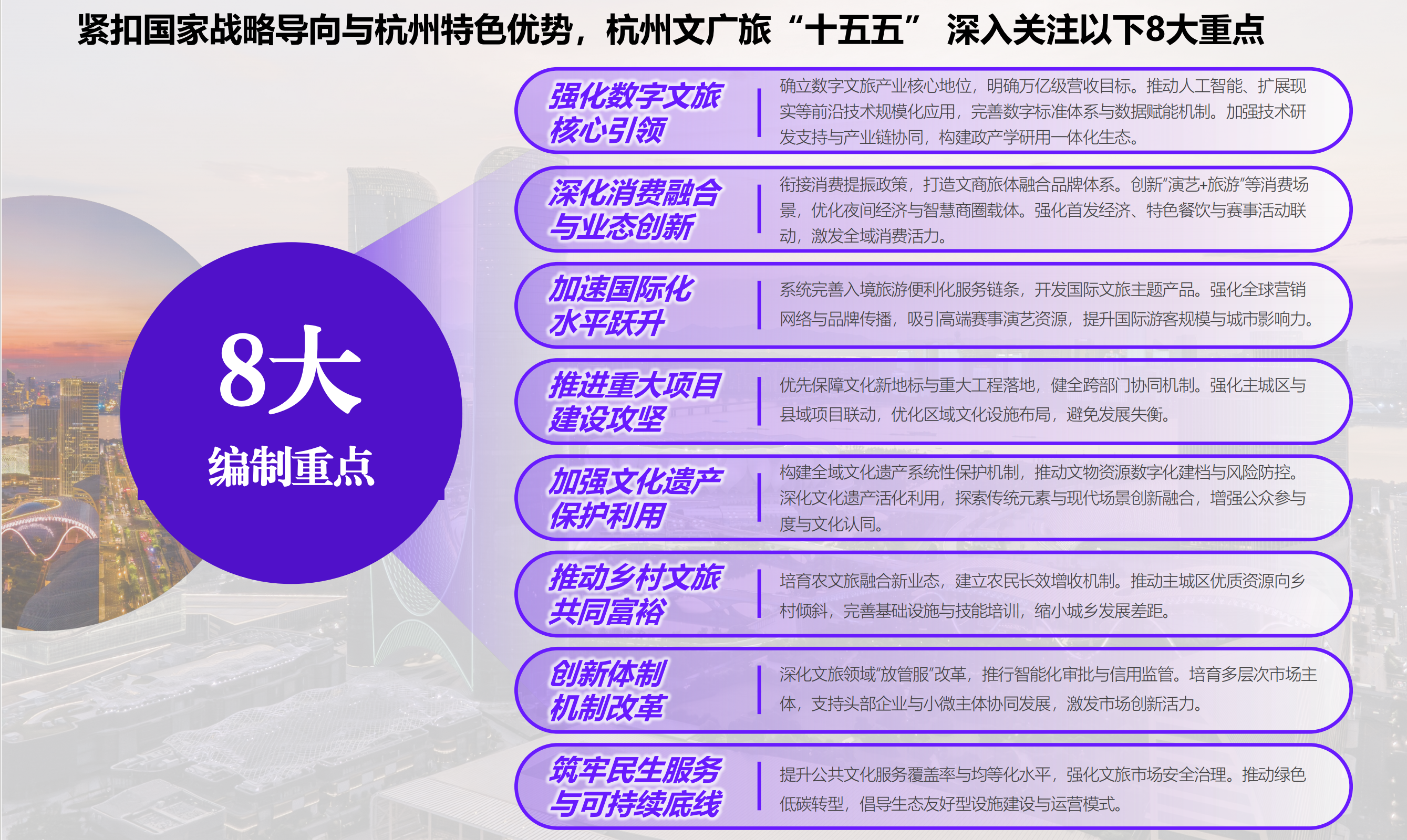 深化科技与人文深度融合。项目依托杭州数字产业优势,推动人工智能、区块链、元宇宙等技术在文旅场景中的创新应用,打造“城市文化CT”、“文旅智能体”等智慧系统,实现文化资源的数字化保存、广泛传播与价值再生。